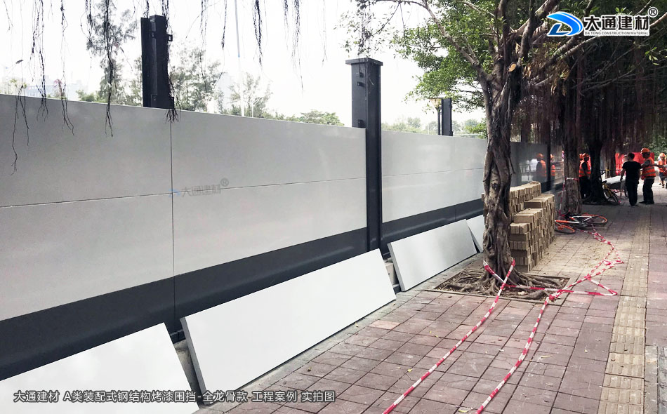 深圳市大通建材圍擋烤漆全龍骨A款是一款施工用防護隔離圍擋。大通建材圍擋A款采用鋼結構設計,安裝穩固,抗風力強力;裝配式,拆裝與運輸都很便捷;雙面烤漆鋼板,表面十分光滑,色調溫和美觀;不易銹蝕,可以很好地抵御強酸強堿的侵蝕,可循環使用。