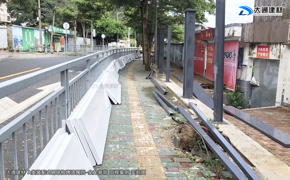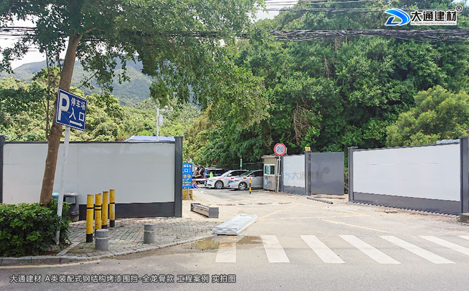 深圳市大通建材裝配式鋼圍擋全龍骨A款 采用裝配式+鋼結構+全龍骨 烤漆鋼板構造 安全穩固 抗風力強 美觀環保 經久耐用,應用于廣東省深圳市大鵬新區楊梅坑改造項目工程中,以下展示的圍擋圖片是大通建材裝配式鋼圍擋全龍骨A款在該項目部分位置的實拍圖