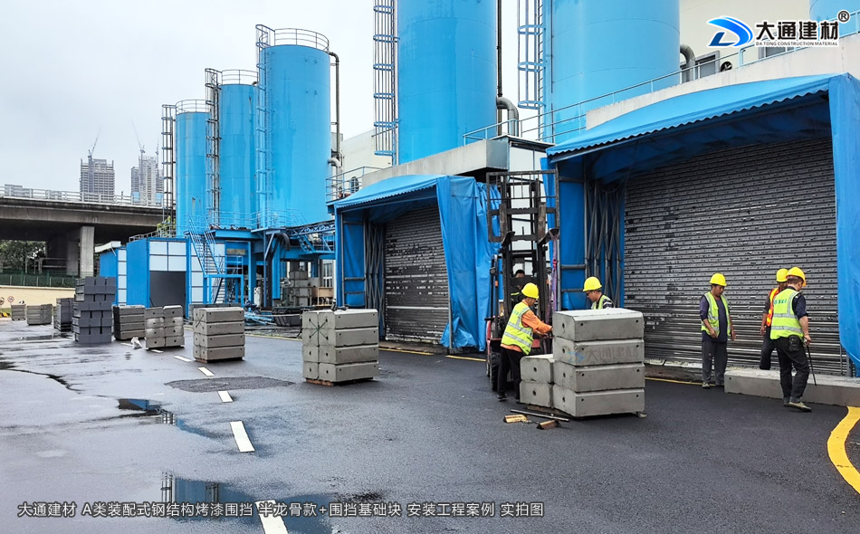 以下展示的圍擋圖片是大通建材把烤漆鋼圍擋A款、圍擋基礎塊送到施工現場后,專業的安裝團隊對產品進行安裝施工環節