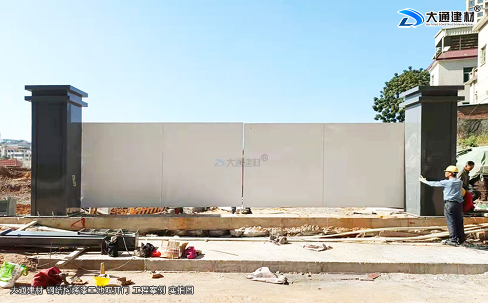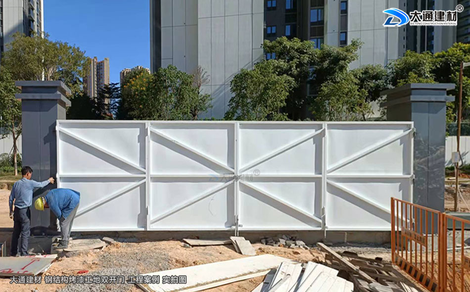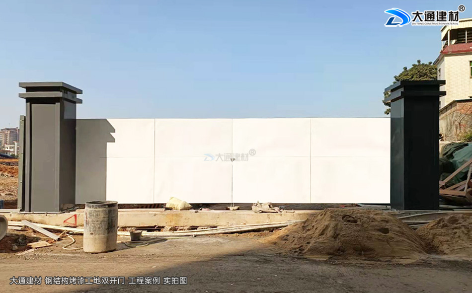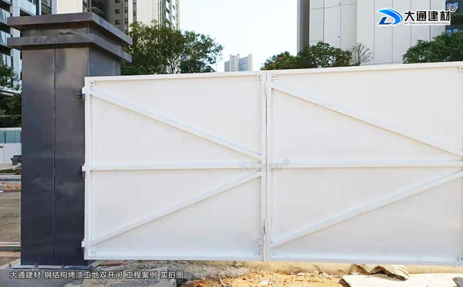 這個建筑工地大門采用的是深圳大通建材生產(chǎn)的項目施工現(xiàn)場的鋼結(jié)構(gòu)烤漆工地雙開門,白色烤漆鋼材制作,雙開門加兩根霸氣大立柱,整個大門看起來很有氣勢