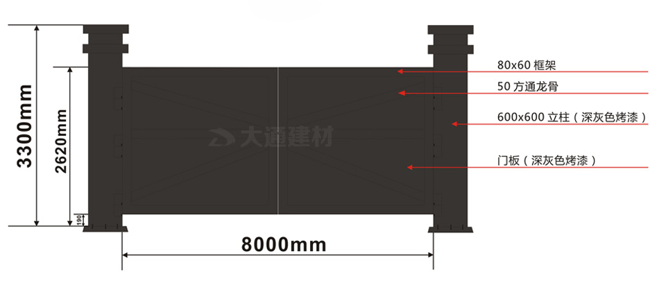 大通鋼結(jié)構(gòu)烤漆款標(biāo)準(zhǔn)工地大門(款式二)規(guī)格參數(shù) 如下圖
